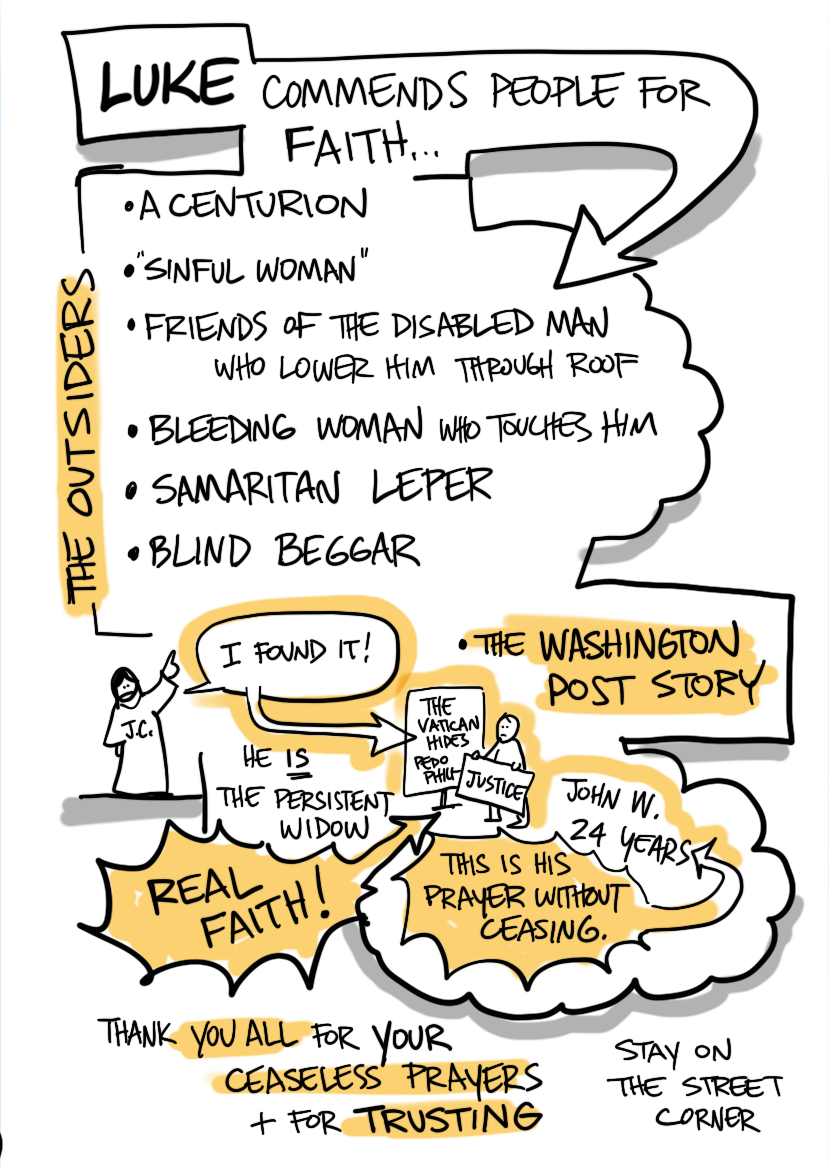 These are my notes from the sermon that Diana Butler-Bass gave at the closing reception. It comes from the lectionary text for the week Luke 18:1-8. (view it here in A Cartoonist’s Guide to Luke)