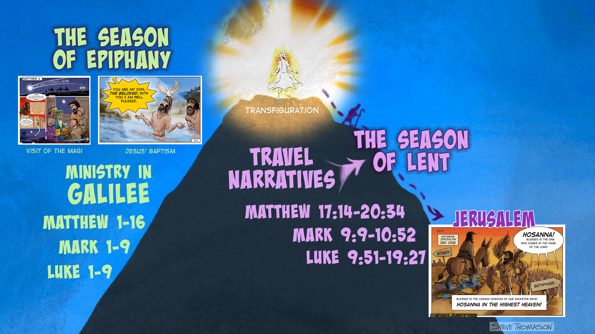 Jesus spends the majority of his public ministry in the northern region of Galilee. The story pivots at the Transfiguration. The Season of Lent traces Jesus’ steps from Galilee to the City of Jerusalem where he faces his final week.