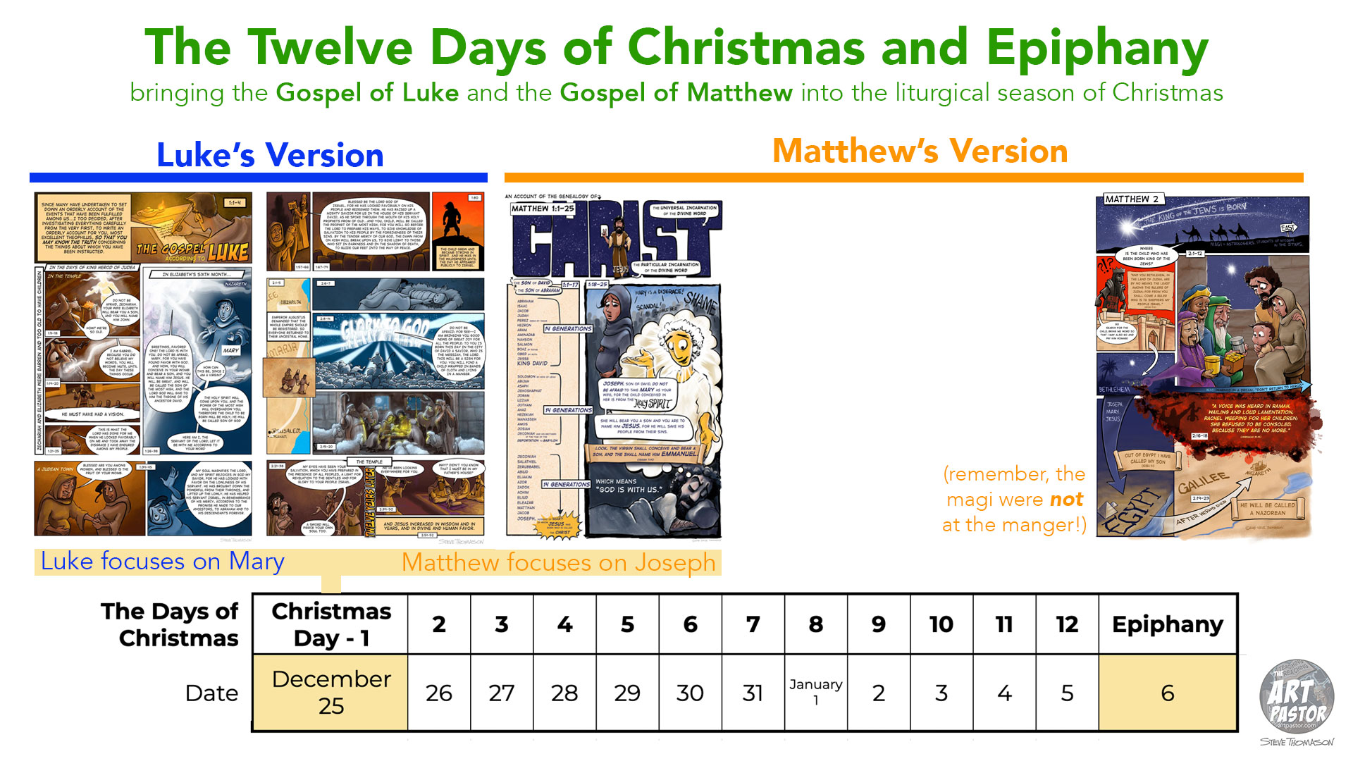 - The liturgical calendar is an attempt to bring together (harmonize) the two birth stories of Matthew and Luke. Therefore, the nativity story of Luke’s Gospel generally kicks off the twelve days of Christmas and Matthew’s story ends the celebration on Epiphany with the arrival of the Magi.